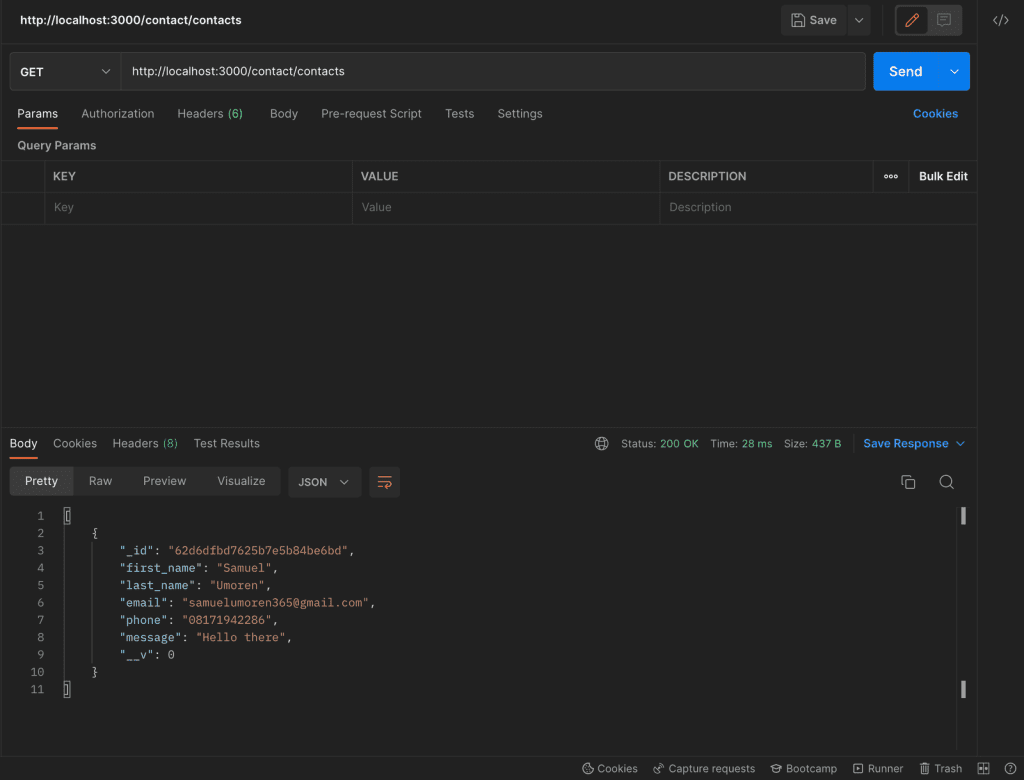 The ValidateObjectId() class implements PipeTransform method from the @nestjs/common module. It has a single method named transform() that takes in the contactId as value in this case. With this method, any HTTP request from the client with a contactId that can’t be found in the database will be regarded as invalid.