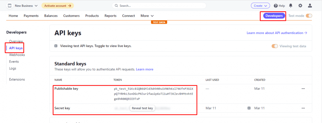 Here, on the left side, you will notice a sidebar menu and from there you have to click on the API Keys Then you will get two keys – one is the Publishable key and the other one is the Secret key The secret key must be secret and you don’t need to reveal it with others.