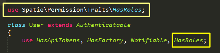 After the migrations, there will be five new tables included in our database named permissions, roles, model_has_permissions, model_has_roles, and role_has_permissions. Now we have to include the HasRoles in our user model.