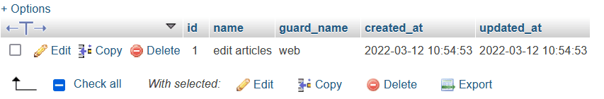 We’ve to find that which permission we want to give to which role. Then if we refresh the page, inside of our role_has_permissions table the role is given permission.