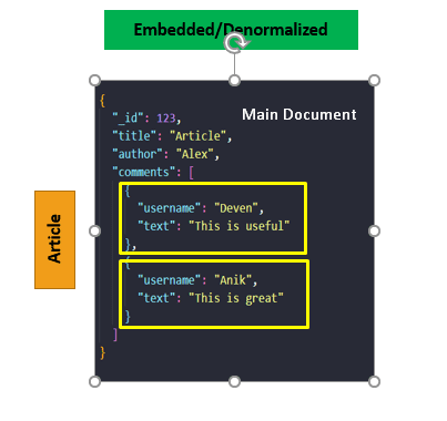 Here, you can see that our main document article and the embedded documents are comments. Where we do not need any separate collections or ID.