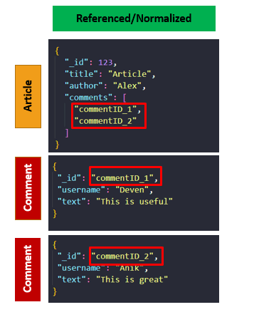 The referenced relationship is also known as the Normalized form. In the referenced form, all the related documents are kept separate. For example, we have one article that has multiple comments.