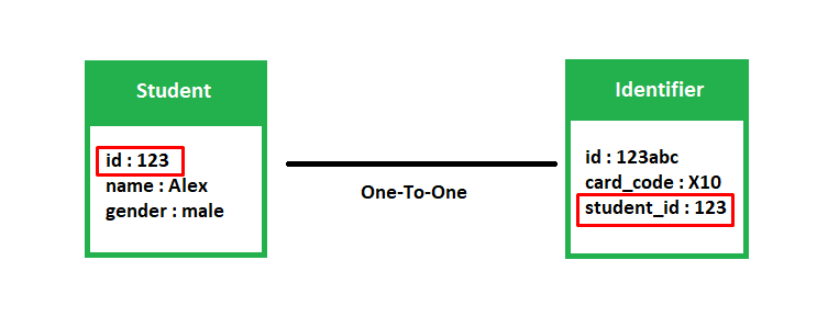 There’s a one-to-one relationship between these two entities. Because a student may have only one unique id. He can not consume multiple ids on the other hand multiple ids can not be the same for one student. Let’s see the below diagram to get a clear understanding of it.
