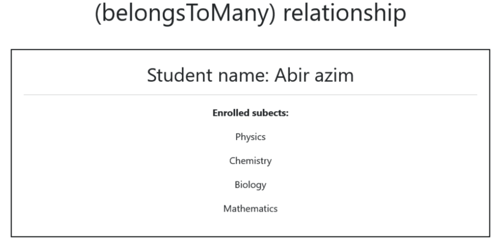 Again, we performed the @foreach loop statement to get results from students() methods implemented in the Subject model.