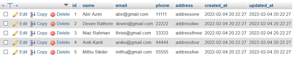 Let’s assume we have a database table named customers. It is a simple table that contains some fields like id, name, email, phone, and address.