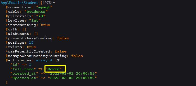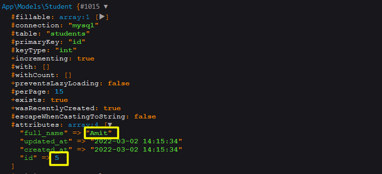In this, example you can see, we called the Student model and apply the firstOrCreate() method. As a parameter, we have to pass an array. In our case, it is ‘full_name’. So, if we print the result with the dd() method, we can see.