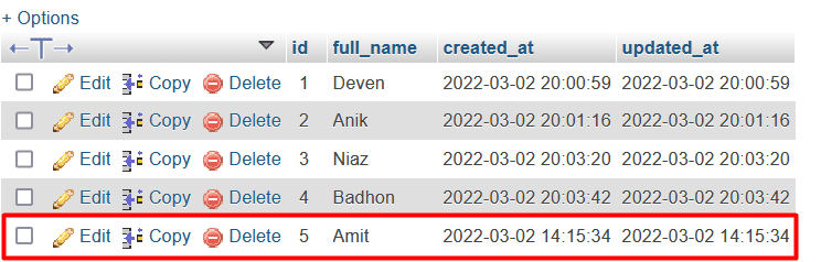 You can see, there is a new data created in our table whose name is “Amit” and id is 5. If we check our database table we can also see the same result-