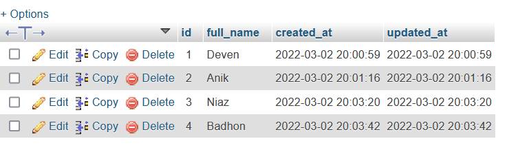 Suppose, we have a database table named students in our database and there are already some stored data like the full name of students. Here is our database table-