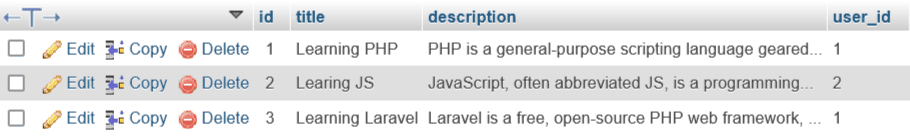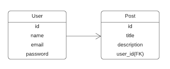 In this user table, we have the same fields as before. On the other hand, the post table has id, title, description, and user_id as foreign key.