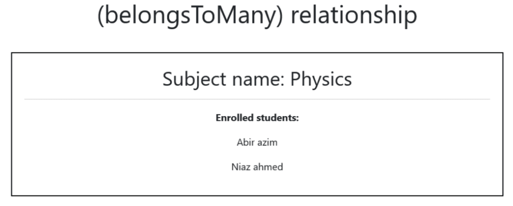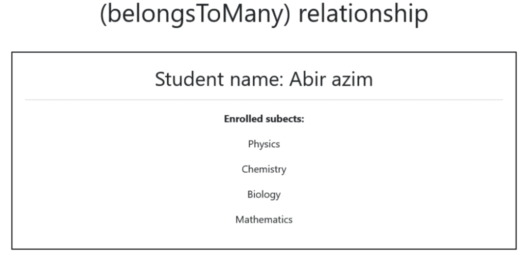 Again, we performed the @foreach loop statement to get results from students() and subjects() methods implemented in the Student and Subject table.