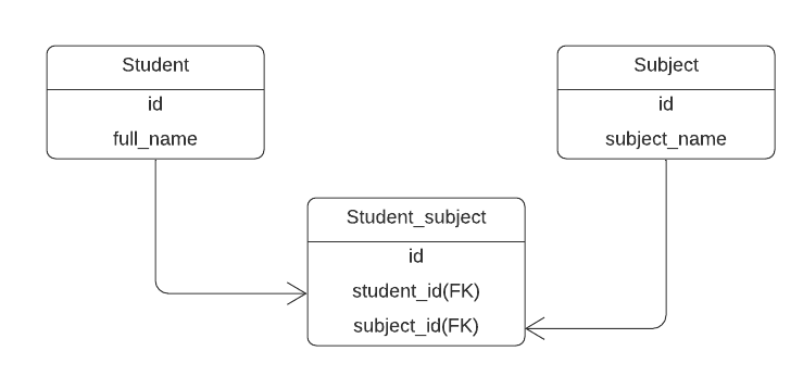 In this student table, we have fields named id and full_name. On the other hand, the subject table has id and subject_name and the Student_subject table takes the student_id and subject_id as foreign keys.