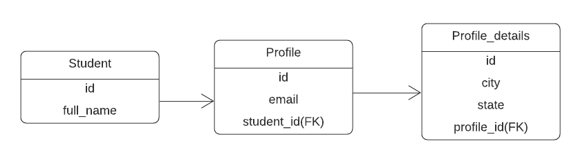 The Profile table takes student_id from the Student table as a foreign key and the Profile_details table has profile_id as a foreign key. So, if we want the Profile_details of a student, we’ve to go through the Profile table first. Inside the Student model, we can implement the hasOneThrough() method to relate Student with the Profile and Profile_details.