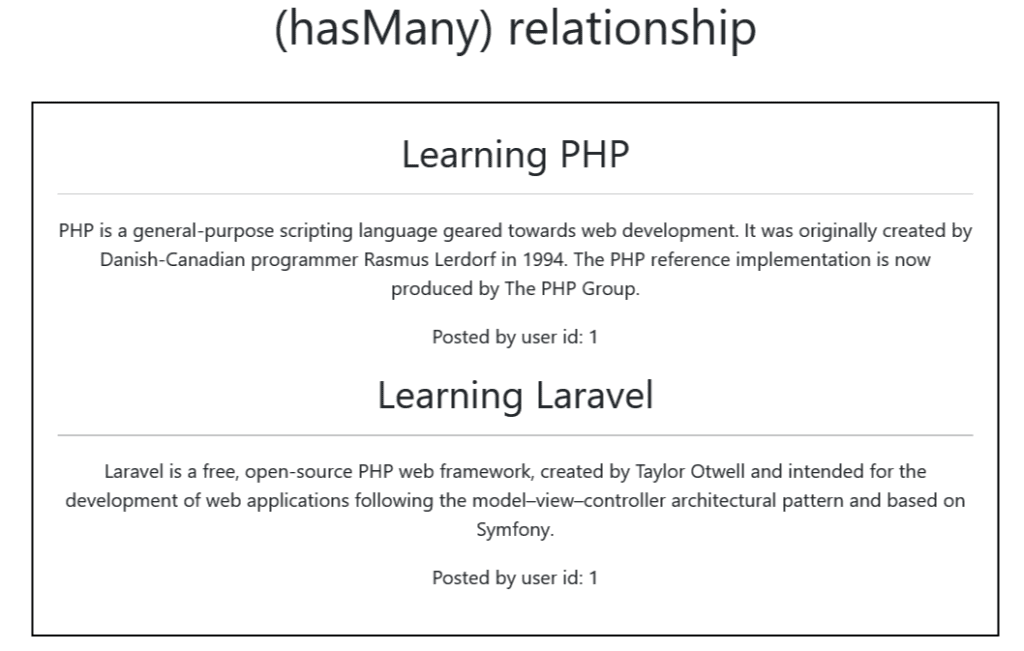 In this view.blade.php file, we looped through the retrieved data from the Post model using @foreach and by using the hasMany() method inside the User model we can get the specific user name. Because we used user_id as a foreign key inside the Post table.