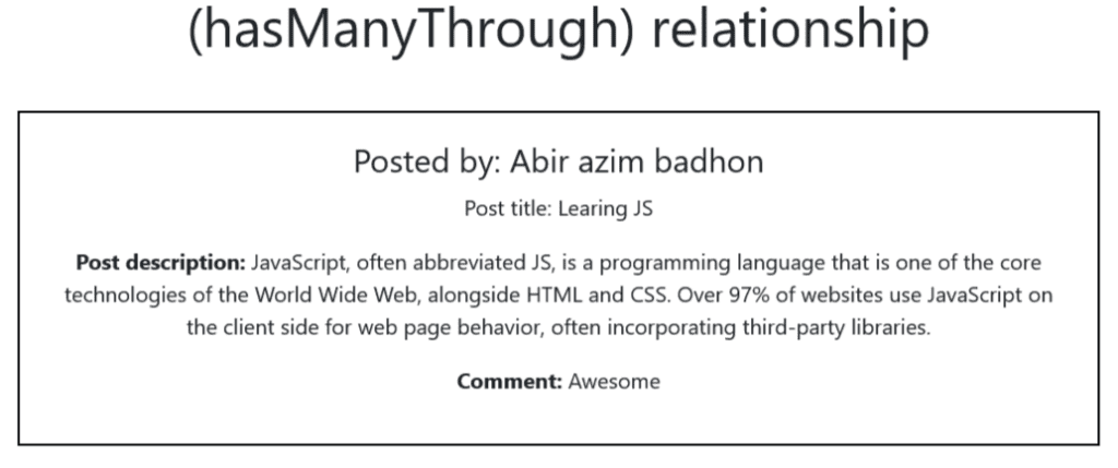 To display the comments of a post, we’ve to perform the @foreach loop twice. At first, we get the user data from the User model, and to access the comment of a post we need to loop through comments data from the comments() method that was implemented in the User model through hasManyThrough relationship.
