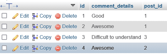 Here, the relation between User and Post model is hasOneThrough relation. On the other hand, the User model connects himself with the Comment model with hasManyThrough relationship. We’ve to pass The Comment model as the first parameter and the Post model as the second parameter.